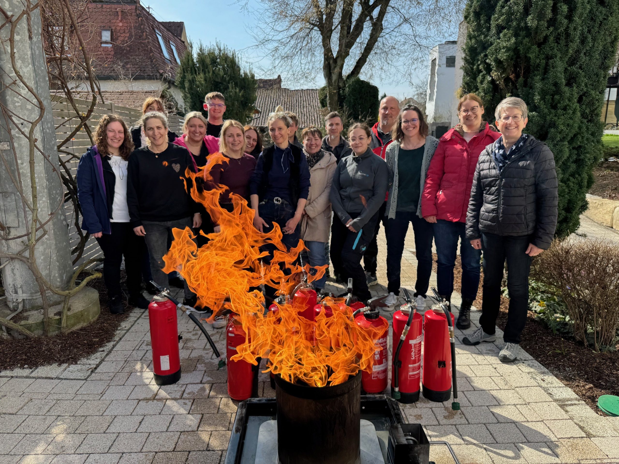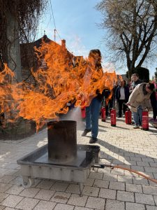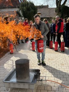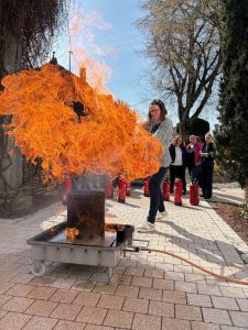 Im Rahmen des Seminars wurden die Teilnehmer in die wesentlichen Grundlagen des betrieblichen Brandschutzes eingewiesen. Behandelt wurden unter anderem die verschiedenen Brandklassen, das richtige Verhalten im Brandfall, die Alarmierung der Feuerwehr sowie die Aufgaben von Brandschutzhelfern im Betrieb. Auch der praktische Teil kam nicht zu kurz. Die Teilnehmer konnten den sicheren Umgang mit dem Feuerlöscher kennenlernen und wichtige Grundregeln für den Ernstfall vertiefen. Solche Unterweisungen helfen dabei, im Notfall schnell, ruhig und richtig zu handeln. Als Übungsgrundlage diente ein Mülleimerbrand.